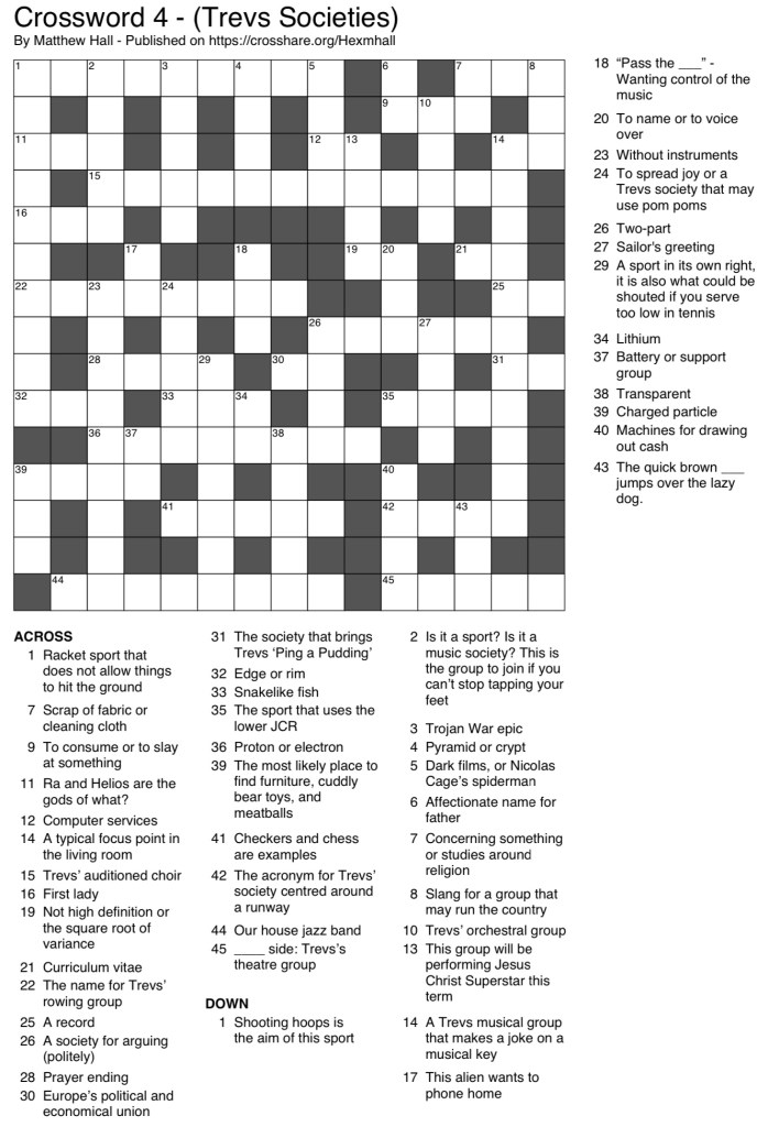 For the fourth crossword, Matthew has themed it around Trevs clubs and societies