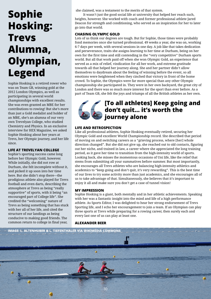 The team have worked incredibly hard to put this edition together, enduring too many of my awkward Zoom meetings. Each page is full of uniquely interesting content, from an interview with Olympian and Trevs alumna, Sophie Hosking, to a brief return to HEX’s satirical origins. I feel very lucky to have had the opportunity to bring together all the people and things that make Trevs unique in this edition, and I hope you find some respite from revision whilst reading it.